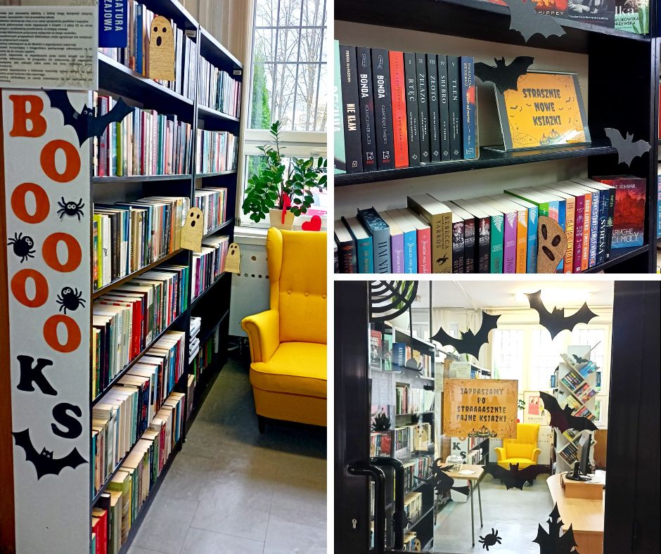 W bibliotece szkolnej w ostatnim tygodniu października zapanował halloweenowy klimat. Wśród mrocznych dekoracji na półkach czekały strrrrasznie ciekawe książki, które aż prosiły się, by zabrać je do domu. Uczniowie chętnie odwiedzali wypożyczalnię, kuszeni magiczną atmosferą i zapachem nowych tytułów, zakupionych w ramach Narodowego Programu Rozwoju Czytelnictwa.