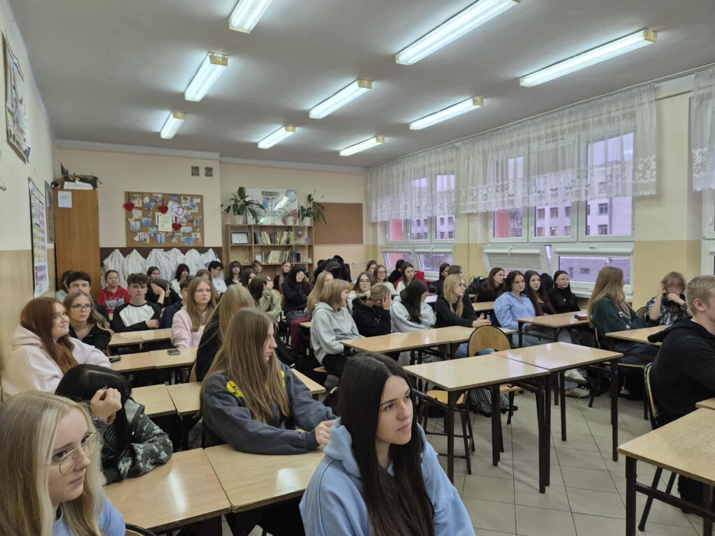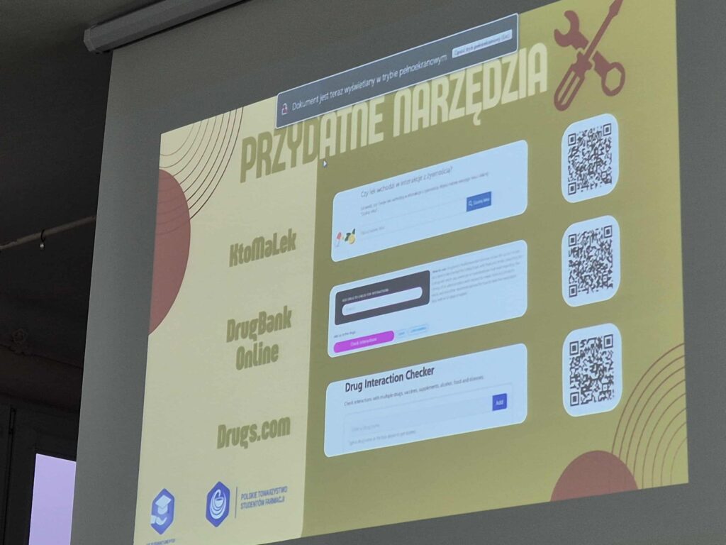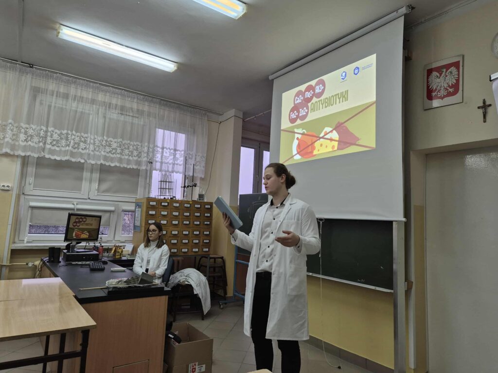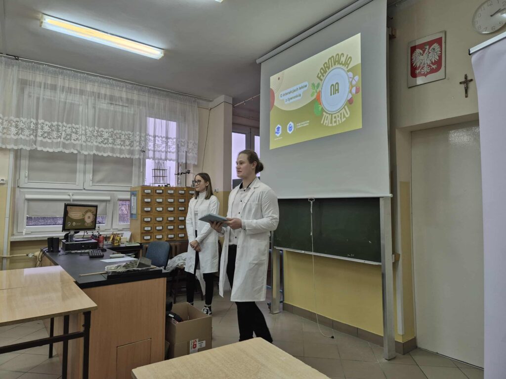 W dniu 17 listopada br. uczniowie klas 2C, 2D, 3C, 3D,3E wzięli udział w ciekawych warsztatach prowadzonych przez studentów farmacji UJK w Kielcach. Tematem warsztatów była FARMACJA NA TALERZU. Uczniowie dowiedzieli się m.in. czym są niebezpieczne interakcje leków z produktami spożywczymi, dlaczego przyjmowane leki powinno się przepijać wodą. Prelegenci przygotowali także ciekawe quizy w których nasza młodzież mogła sprawdzić swoją wiedzę; miłym akcentem były pamiątkowe gadżety, które wręczali studenci. Chętni uczniowie mogli również zadawać pytania związane ze studiami na kierunku farmacja.