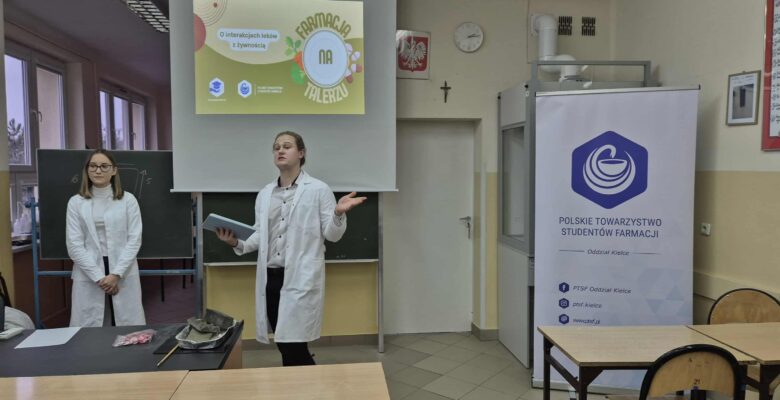W dniu 17 listopada br. uczniowie klas 2C, 2D, 3C, 3D,3E wzięli udział w ciekawych warsztatach prowadzonych przez studentów farmacji UJK w Kielcach. Tematem warsztatów była FARMACJA NA TALERZU. Uczniowie dowiedzieli się m.in. czym są niebezpieczne interakcje leków z produktami spożywczymi, dlaczego przyjmowane leki powinno się przepijać wodą. Prelegenci przygotowali także ciekawe quizy w których nasza młodzież mogła sprawdzić swoją wiedzę; miłym akcentem były pamiątkowe gadżety, które wręczali studenci. Chętni uczniowie mogli również zadawać pytania związane ze studiami na kierunku farmacja.