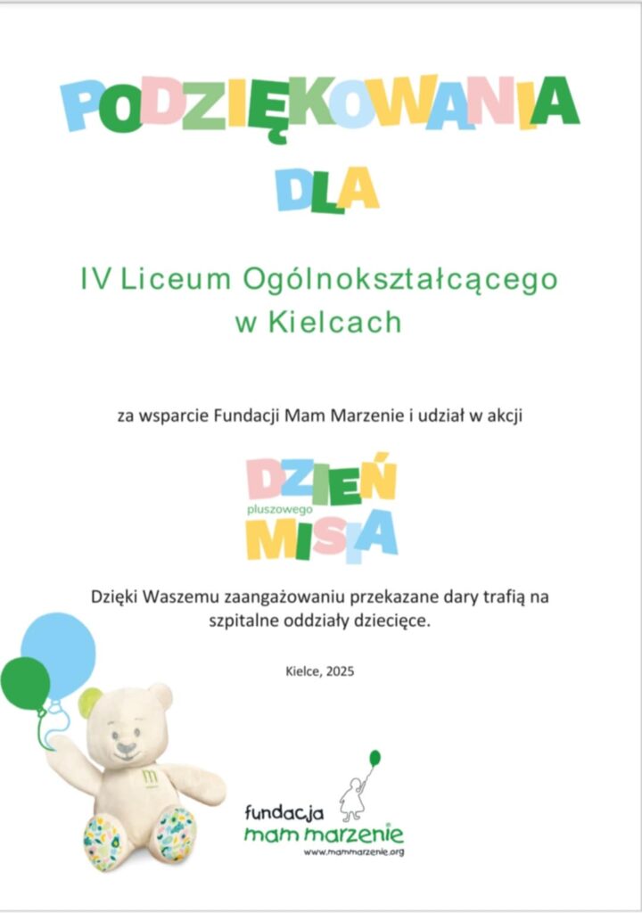 W dniu 24.11. 2025 r. zakończyliśmy akcję „Dzień Pluszowego Misia” podczas której zebrane zostały zabawki, misie, gry, przybory plastyczne dla potrzebujących dzieci przebywających na oddziałach kieleckich szpitali. Zbiórka przerosła nasze oczekiwania, dziękujemy uczniom, wychowawcą klas, które dołożyły wszelkich starań, by obdarować nie tylko prezentami, a przede wszystkim uśmiechem wszystkie dzieci, które otrzymają upominki. Dziękujemy:)