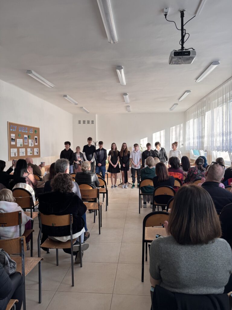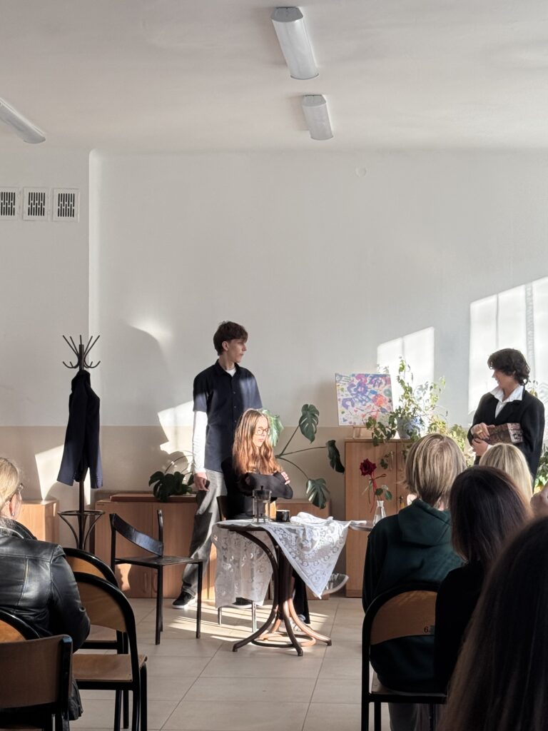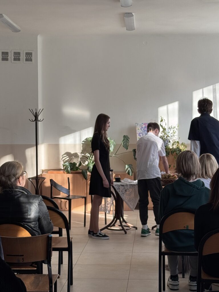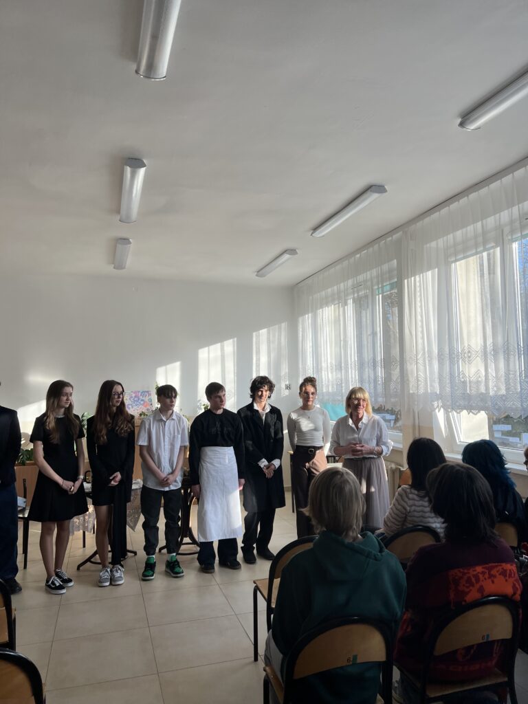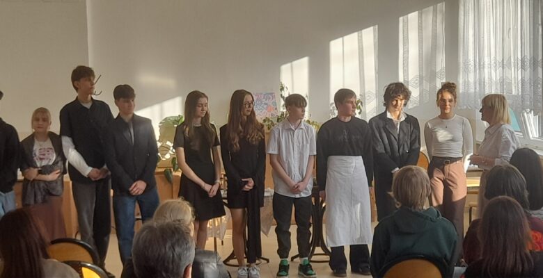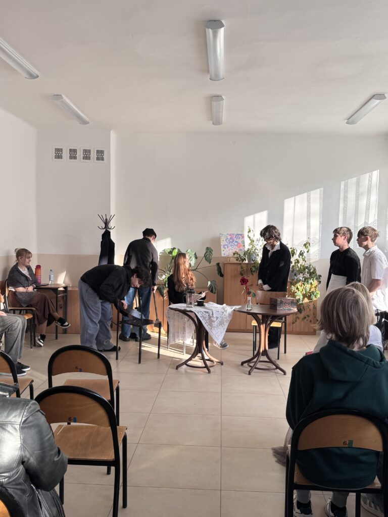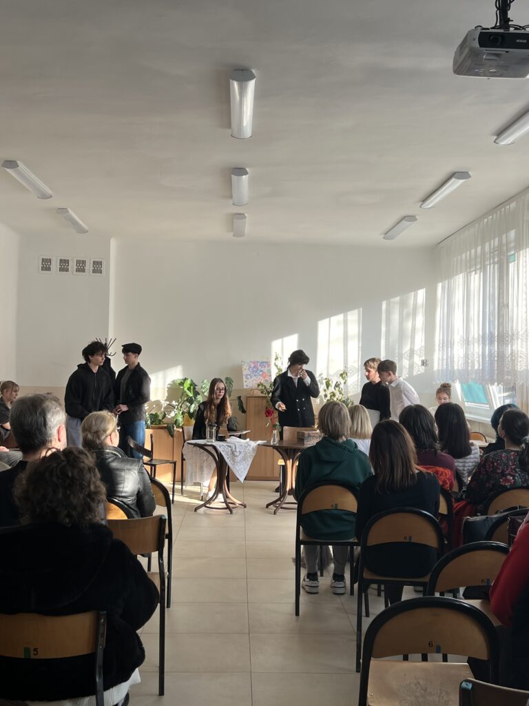 Dziś (18 marca 2026 r.) podczas Dnia Otwartego w IV LO, czyli spotkania rodziców z wychowawcami i nauczycielami uczniowie kl. IB i IE wcielili się w role aktorów. Przygotowali miniaturę sceniczną opartą na fragmentach ,,Skąpca” Moliera. Aktorzy doskonale oddali charakter granych postaci. Ich zaangażowanie zostało nagrodzone przez publiczność gromkimi brawami.
