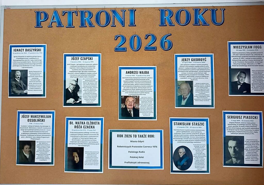 Z tej okazji biblioteka szkolna przygotowała ekspozycję poświęconą patronom roku 2026. Dostępna będzie ona przez cały rok na szkolnym korytarzu.