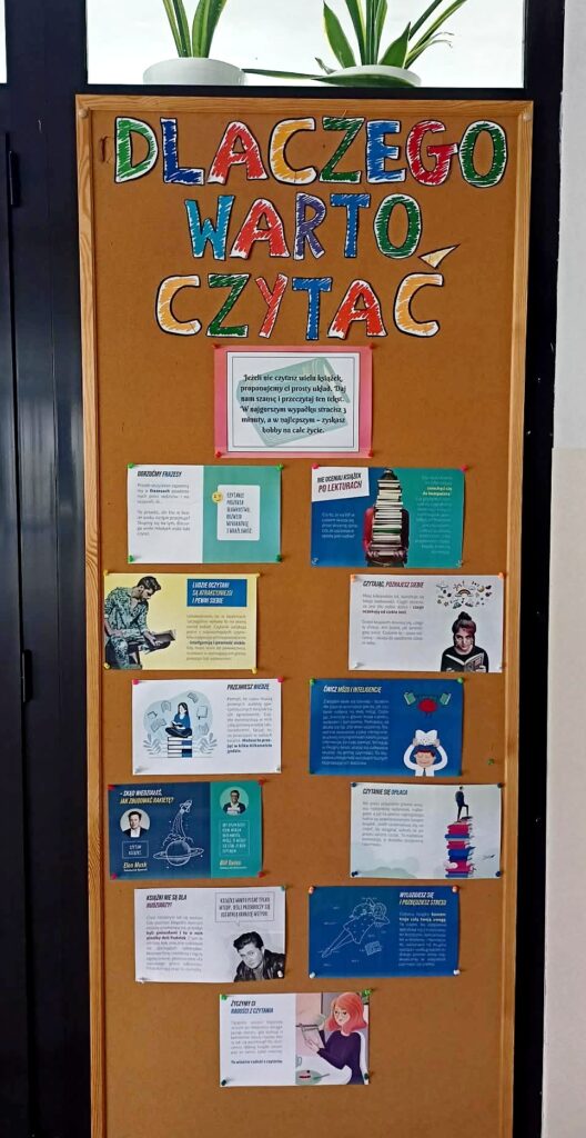 Biblioteka przygotowała i wywiesiła na holu gazetkę pt. „Dlaczego warto czytać”. Na gazetce można znaleźć wiele ciekawych informacji o korzyściach płynących z czytania – od rozwijania wyobraźni i poszerzania słownictwa, po zdobywanie wiedzy i lepsze rozumienie świata.