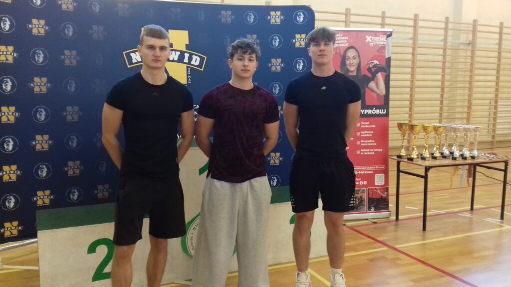 W dniu 04.11.2025 r. w III Liceum Ogólnokształcącym im. C.K. Norwida w Kielcach odbyły się kolejne zawody siłowe w wyciskaniu sztangi na ławeczce płaskiej. Naszą Szkołę w zawodach reprezentowało trzech zawodników : Kozera Karol z klasy 4 C, Bęben Bartłomiej z klasy 4 F w kategorii do 74 kg i Mateusz Ciszek z klasy 3 E w kategorii do 81,5 kg. Każdy ze startujących w zawodach uczestników miał do wykonania trzy boje z zadeklarowanym ciężarem na sztandze. Wszyscy Nasi reprezentanci uplasowali sie poza podium osiągając bardzo dobre rezultaty : Kozera Karol wycisnął ciężar 92,5 kg , Bartłomiej Bęben zakończył boje z wynikiem 105 kg a Mateusz Ciszek w swojej kategorii wagowej wycisnął ciężar 105 kg.